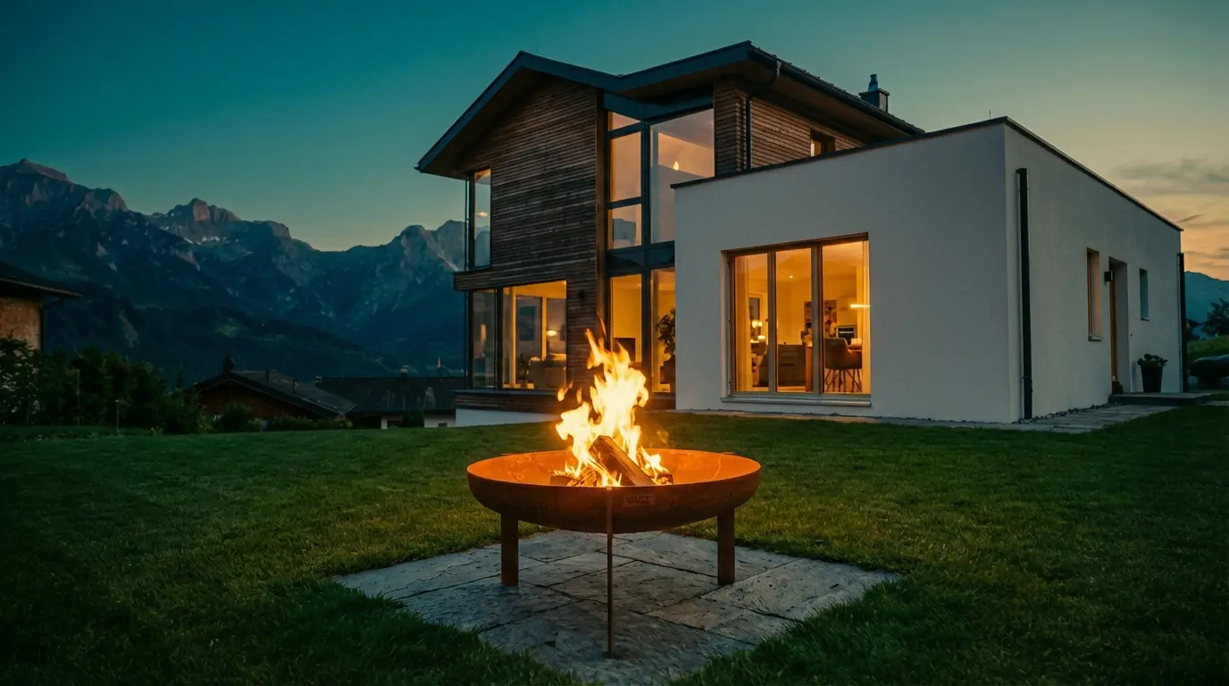 Robuste Feuerschale aus massivem Rohstahl mit integriertem, verstellbarem Grillrost. Ein langlebiges Unikat für Ihren Garten, das mit der Zeit eine charakteristische Edelrost-Patina entwickelt.