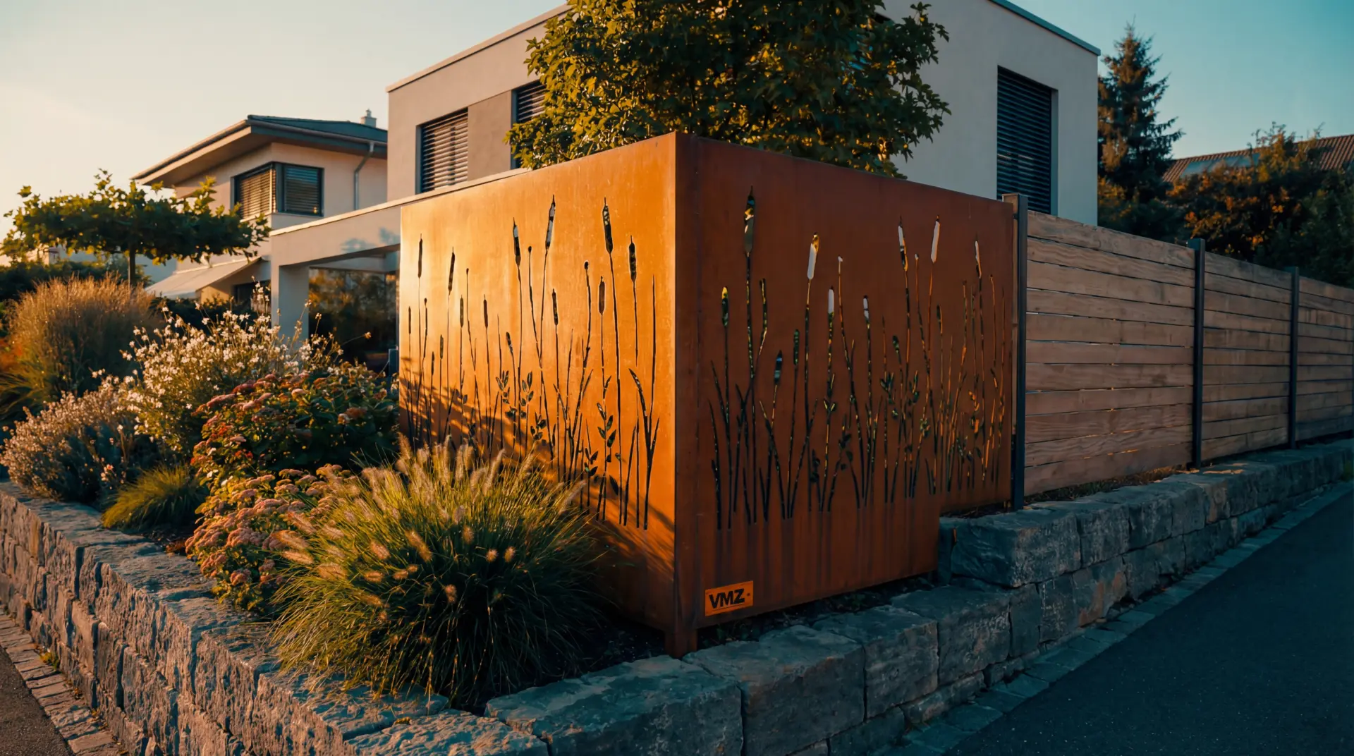 Kunstvoller Sichtschutz aus massivem Rohstahl mit filigranem Lasermotiv. Die ideale Kombination aus Privatsphäre und Gartendekoration, die mit der Zeit eine charakteristische Edelrost-Patina entwickelt.